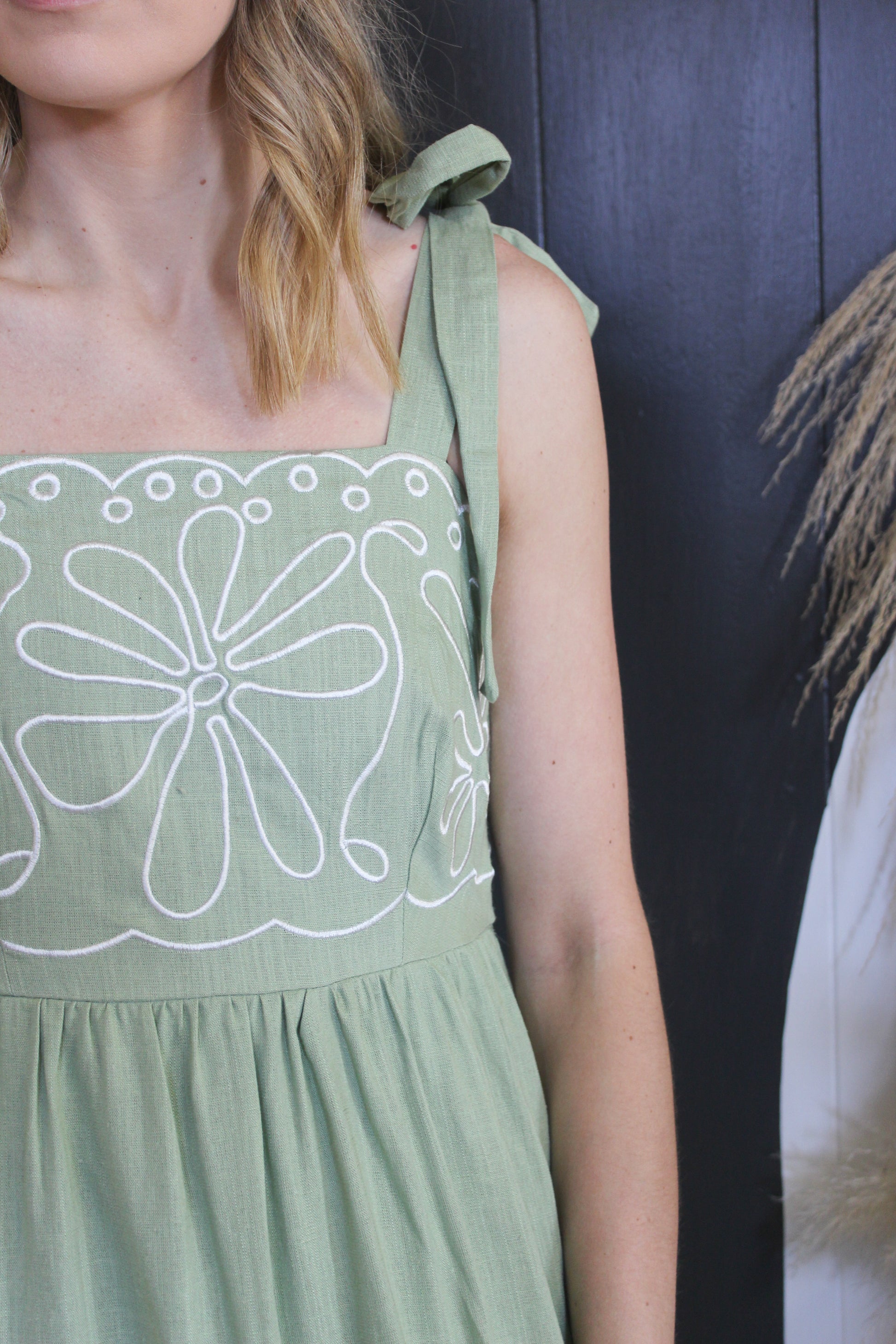Effortlessly feminine and made for sunny days 🌾 The Wildflower Midi Dress features a soft sage base with the sweetest embroidered floral detail across the bodice. The tie straps add a bold, eye-catching touch while keeping the look soft and romantic.